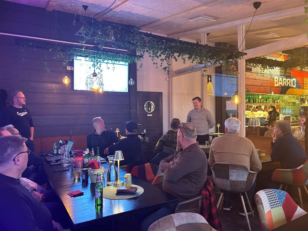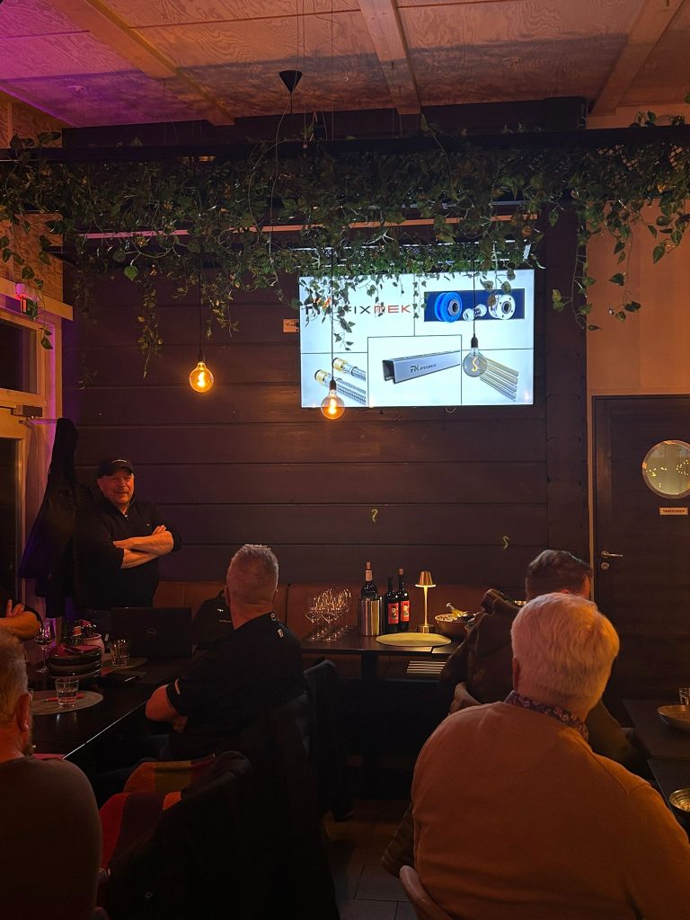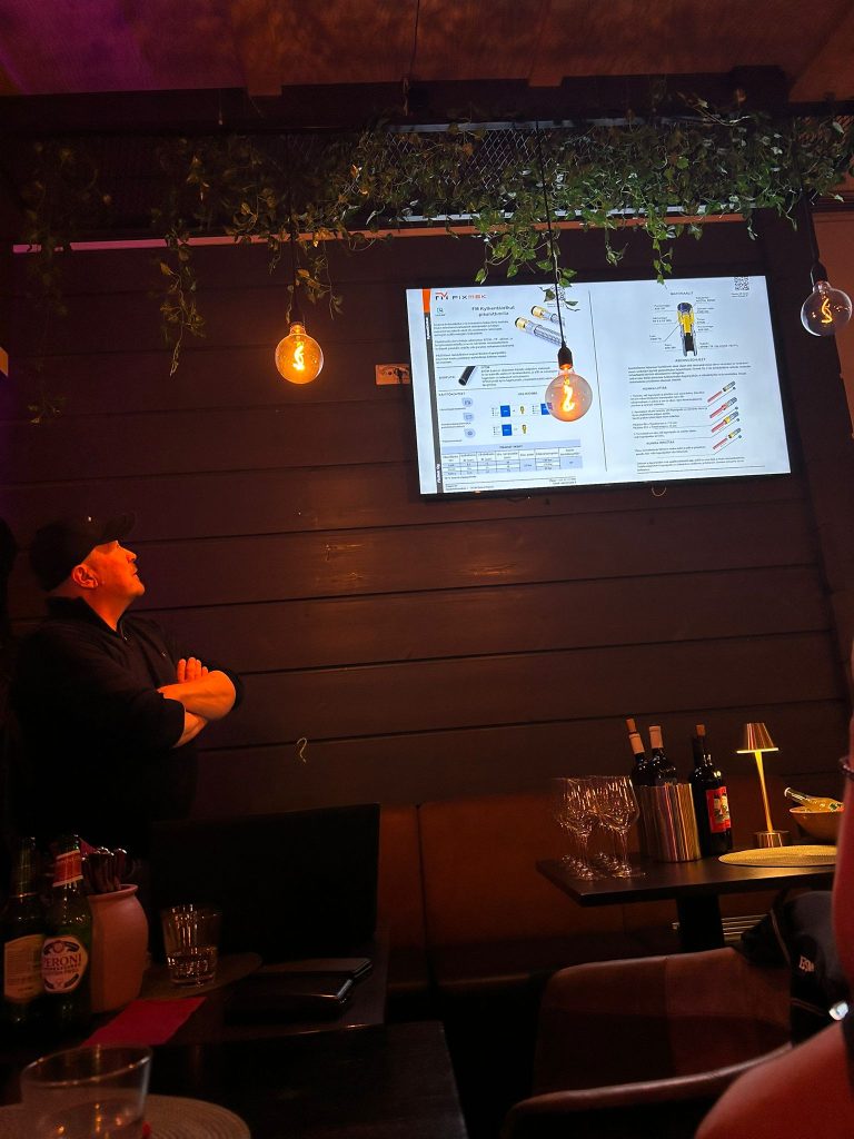 Illan isäntänä toimi Toni Rastas, hallituksen jäsen ja FixMek Oy:n edustaja. Toni esitteli FixMekin toimintaa ja tuotteita — yritys on pieni mutta luotettava toimittaja, joka tunnetaan hyvästä palvelusta ja joustavasta tekemisen meiningistä. Esitys herätti paljon keskustelua ja kiinnostusta osallistujien keskuudessa.