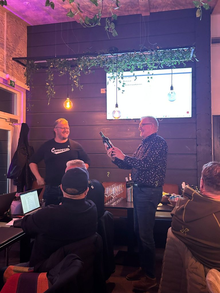 Kokouksen viinipulloarvonnan voitti Paulan arpomana Eerik Nieminen.